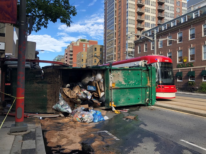 Toronto police say two people were sent to hospital after a garbage truck flipped on its side in a collision with a TTC streetcar.