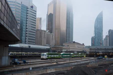 The Lakeshore West GO line runs parallel to the Gardiner Expressway on its way to Hamilton.