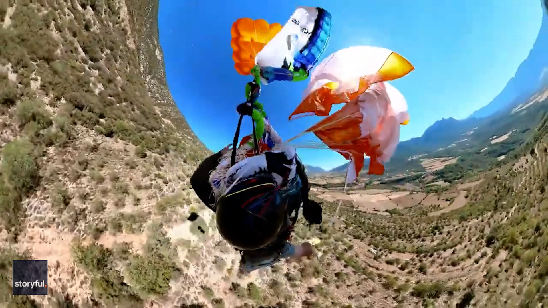 An acro paraglider in Organya, Spain experienced the fright of a lifetime when he came seconds from plunging to his death after the brake line became stuck.