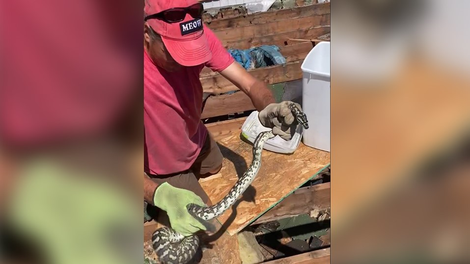 He clambered up the ladder to the shed’s dismantled roof, walked across the beams and did what the two construction workers weren’t willing to do: Reach down and grab the olive green and black-patterned snake.