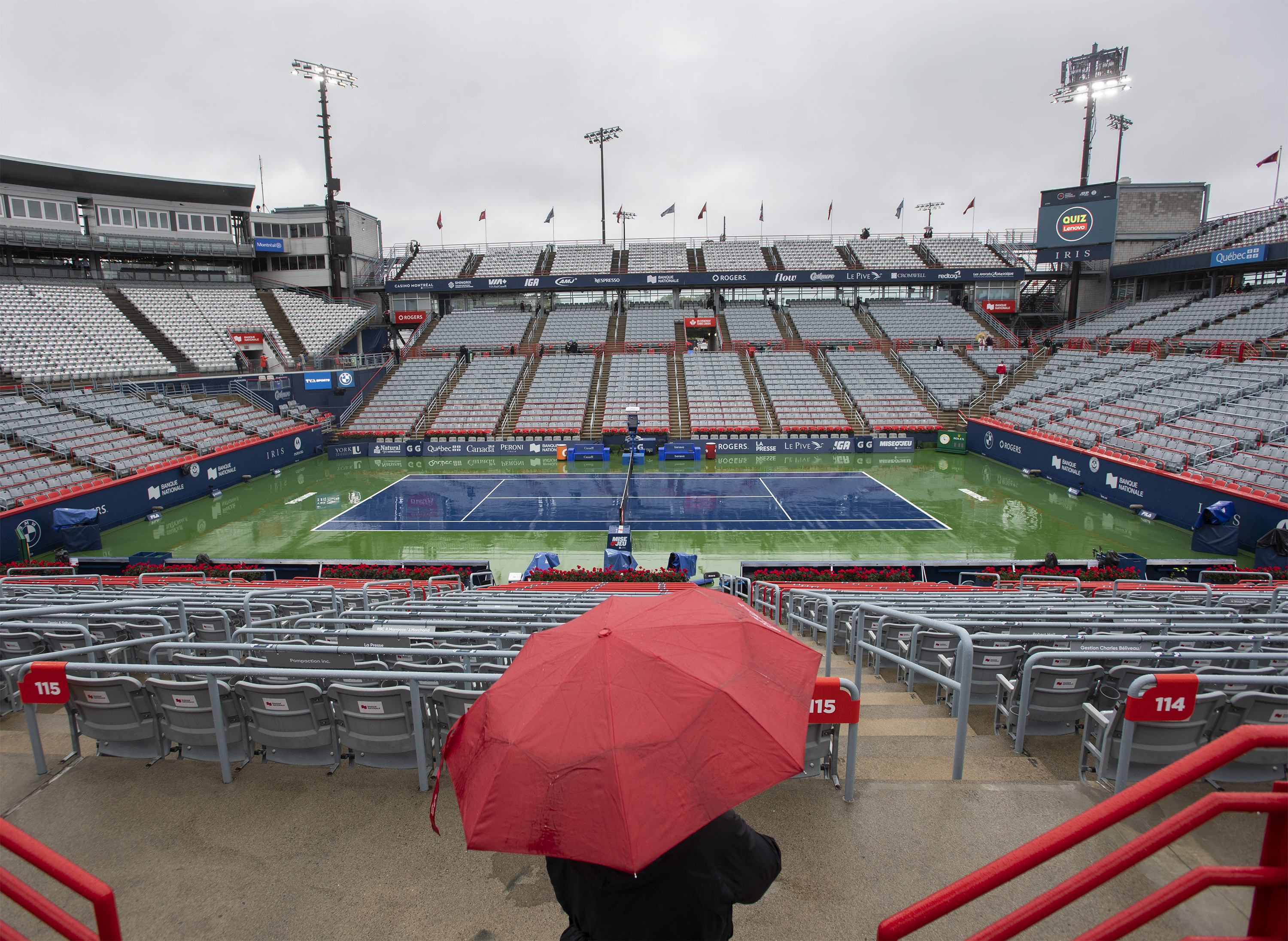 Rain has delayed the start of men’s first-round singles play Monday at the National Bank Open.