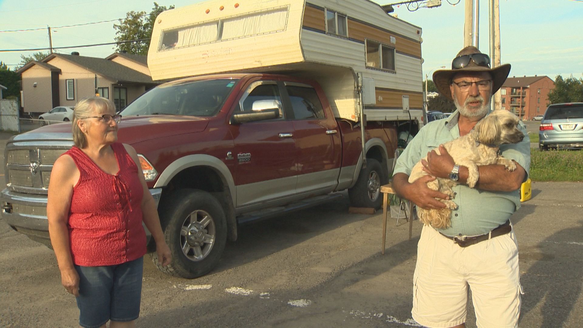Manny and Effie Silveira, residents of Saltcoats, Sask., have set up a makeshift campsite along a residential street in St-Jerome, Que., as they await parts for truck repairs.