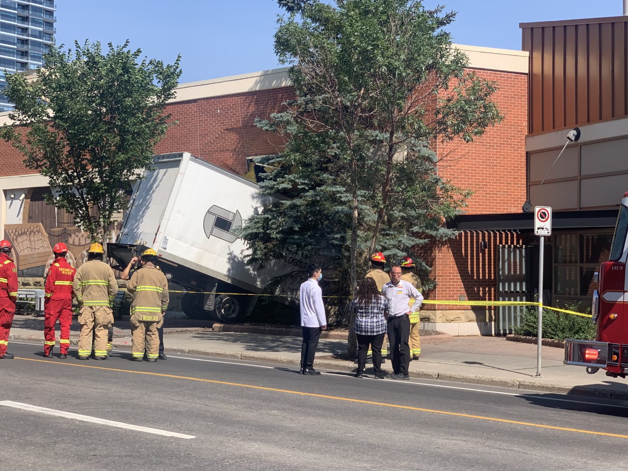 Witnesses told Global News the truck almost hit a few people on the sidewalk before crashing into the building. They also said a person exited through a hole and walked away from the scene.