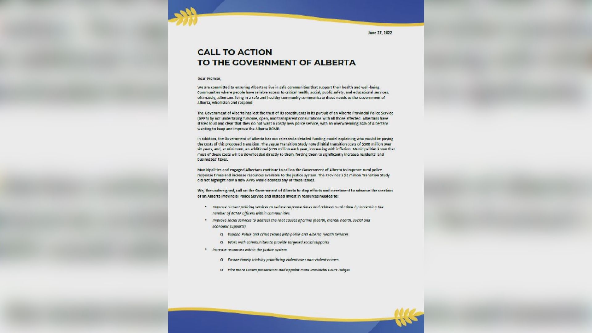 A group of more than 50 rural municipalities sent a call to action to the government of Alberta in June to stop development of the program, with hopes funding would instead go towards increasing the number of rural RCMP officers improving social services, and increasing resources within the justice system.