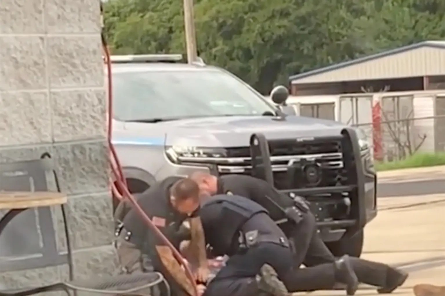 In the video, which was posted to social media, the officers are seen restraining a man on the sidewalk as they violently punch the person’s head and knee him in the back and side.