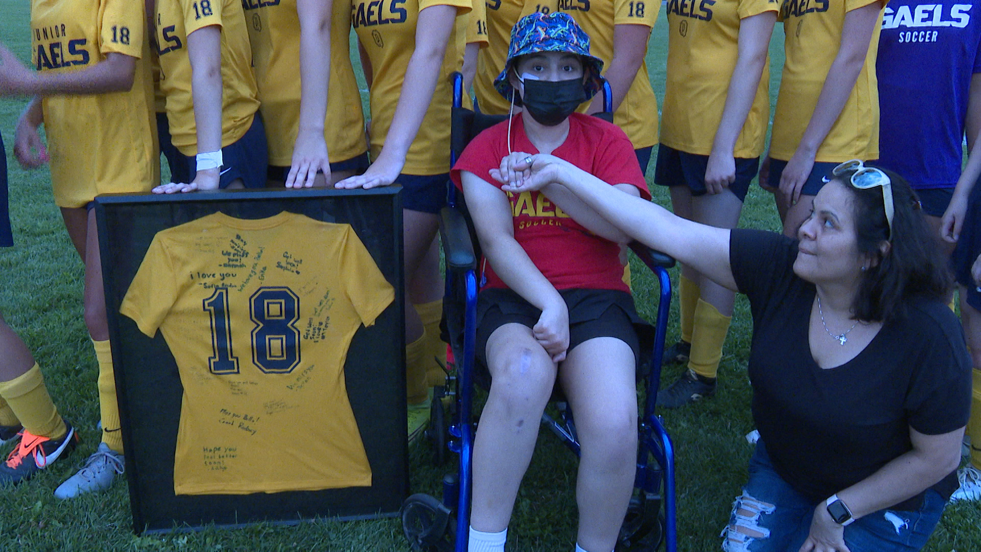 To mark Bella’s return to watching them on the field, her teammates presented her with a framed jersey with all of their well wishes written on it.