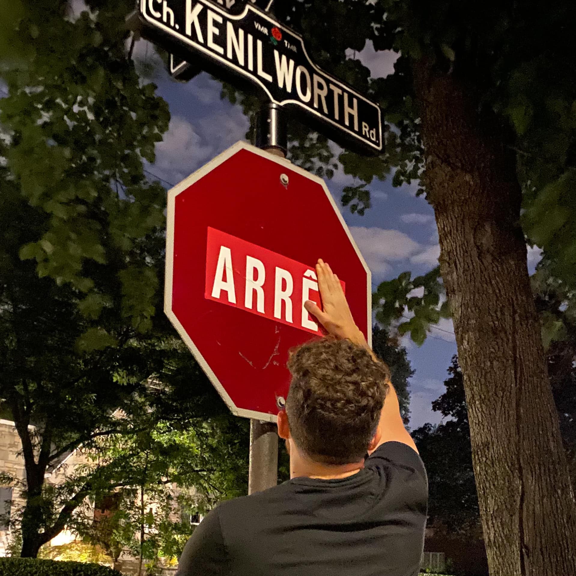 According to the regulations on road signs in Quebec, both the French “Arrêt” and English version of the iconic red sign are permitted.