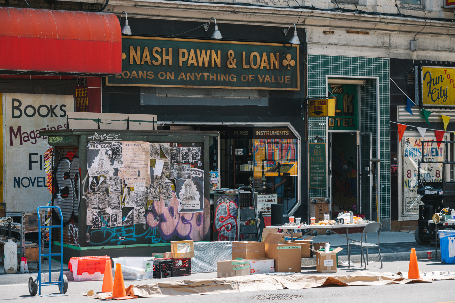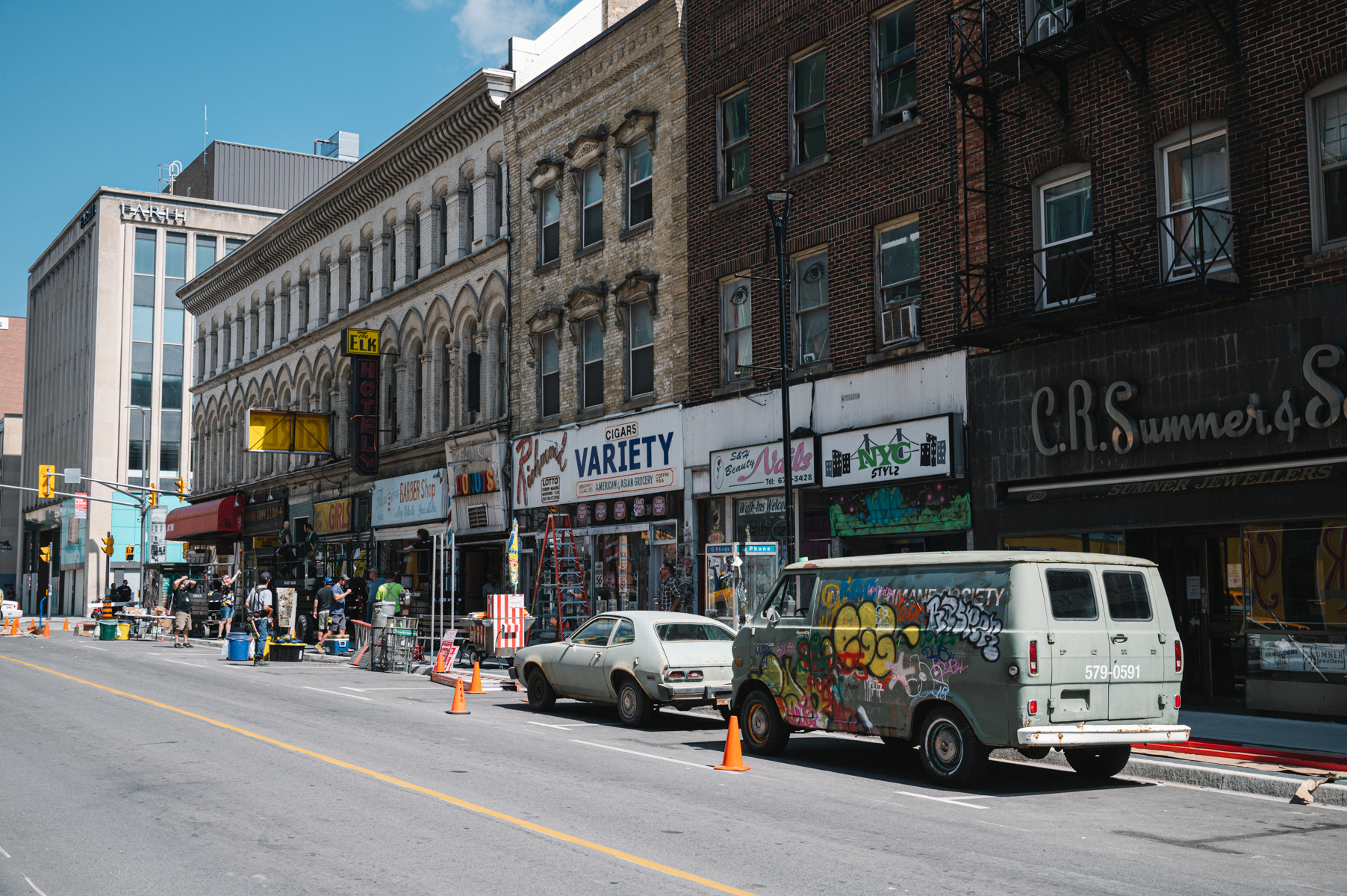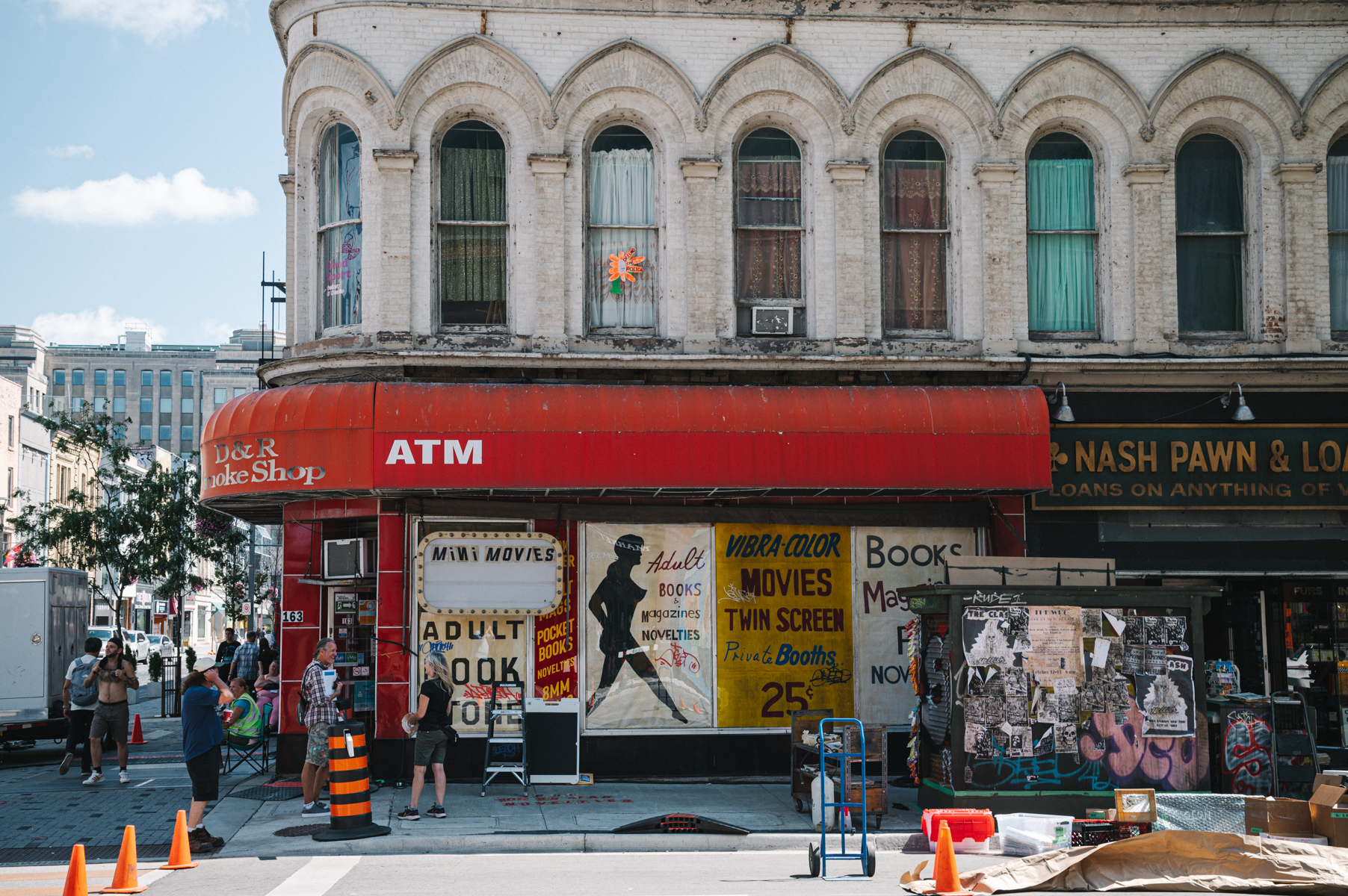 Richmond Street was blocked off by police between Dundas and King streets as crew members put the finishing touches on the 1970s-era New York streetscape, complete with vintage vehicles, a newsstand, fake graffiti, and signs advertising adult entertainment and cheap hotel rooms.