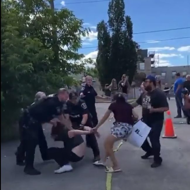 Several individuals then confronted officers who were entering the parking lot in a vehicle, leading to two men being arrested that day, being literally dragged into the police station as followers yelled at officers and followed them to a rear exit door. A third individual was arrested a day later.
