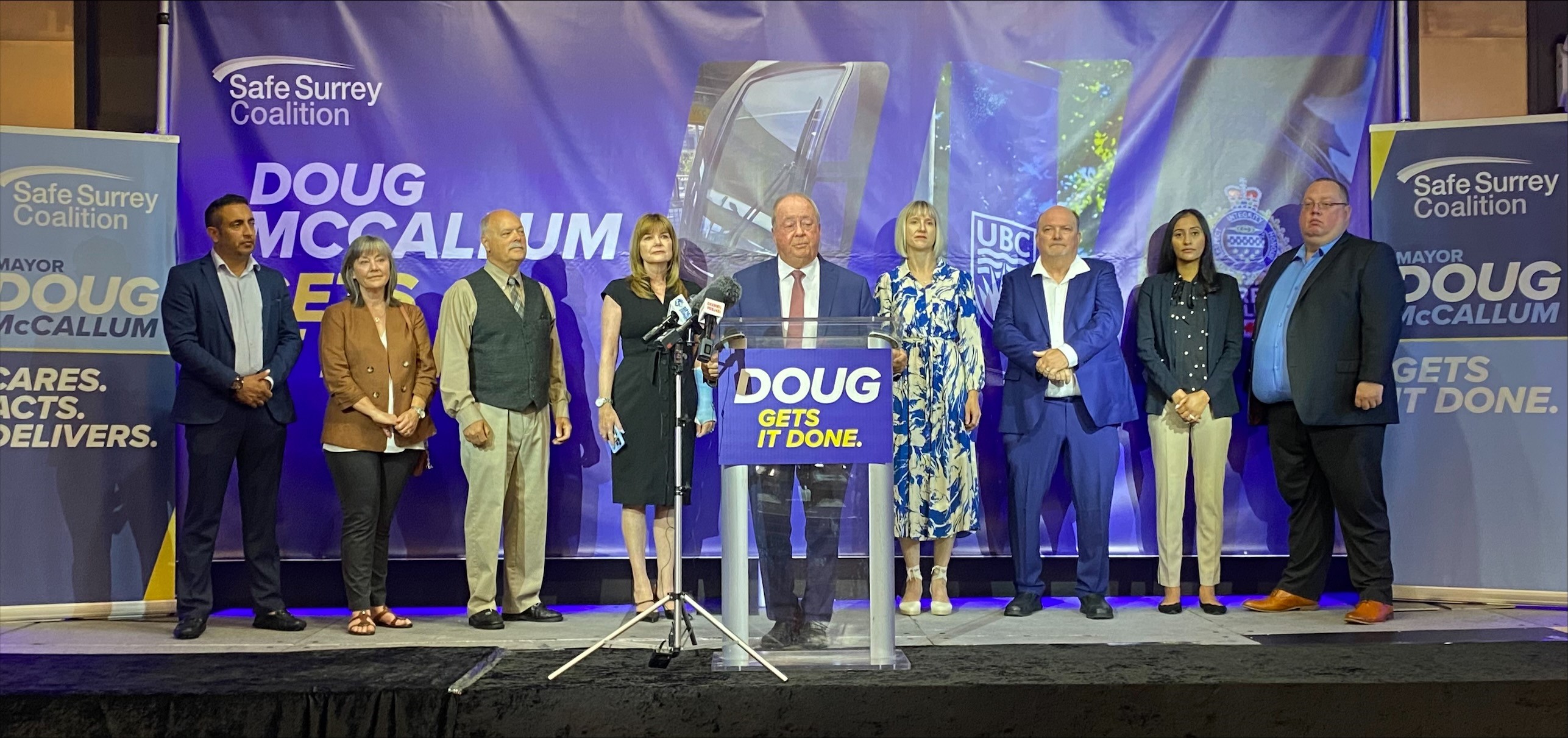 McCallum appeared Thursday next to his Safe Surrey Coalition council candidates, incumbents Allison Patton, Mandeep Nagra, Laurie Guerra, and Doug Elford; and newcomers Debra Antifaev, Stuart Drysdale, John Gibeau, and Raman Jassar.