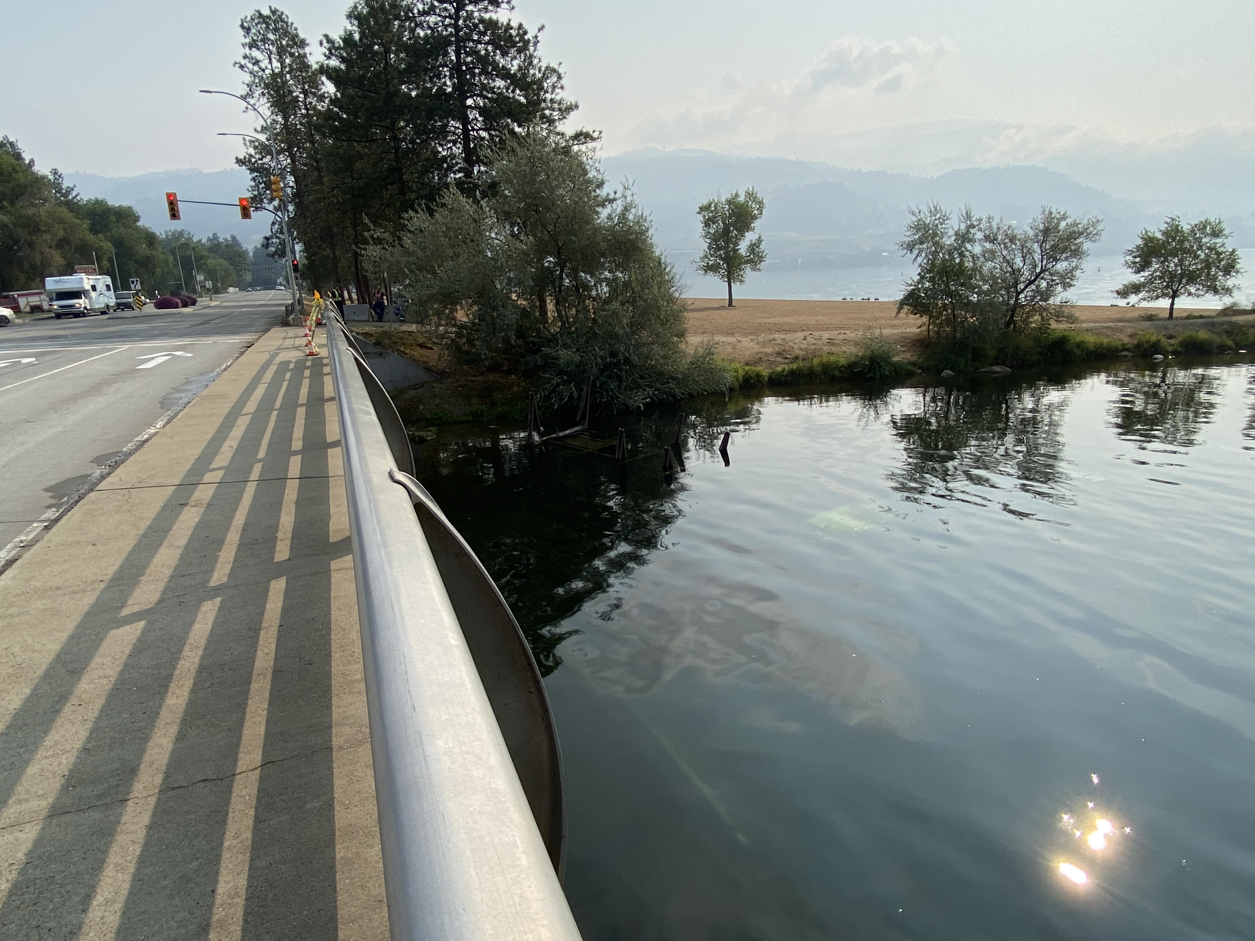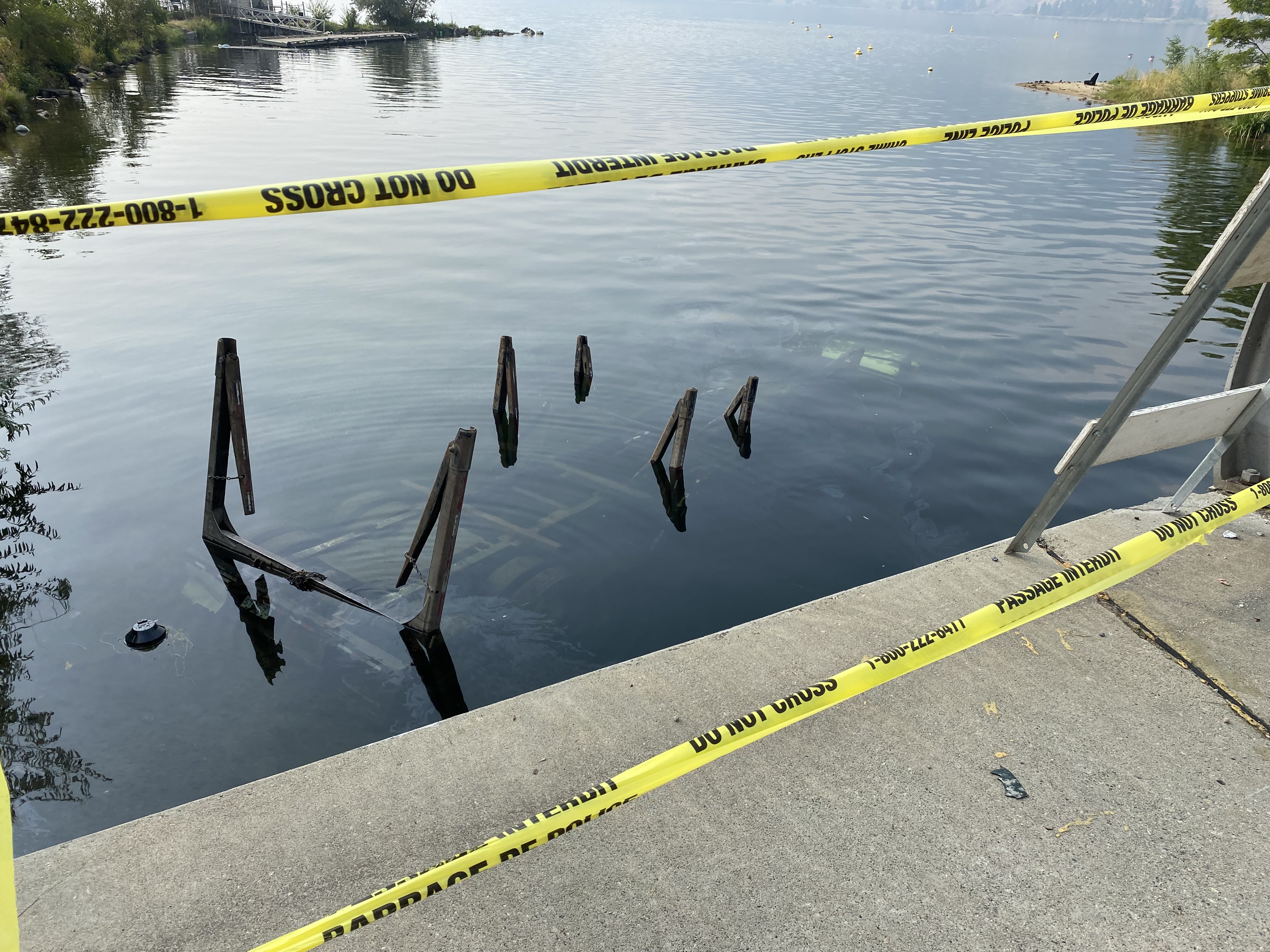 A logging truck was submerged in Penticton Channel after crashing through a guardrail along the Channel Parkway in Penticton, B.C.