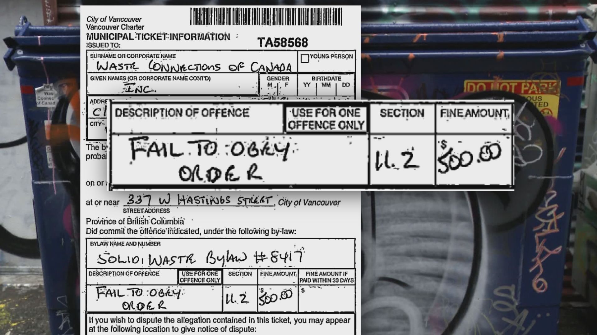 In March, the city warned Waste Connections that McKie’s bin violated solid waste bylaws because the hauler label and user address were obscured by graffiti.