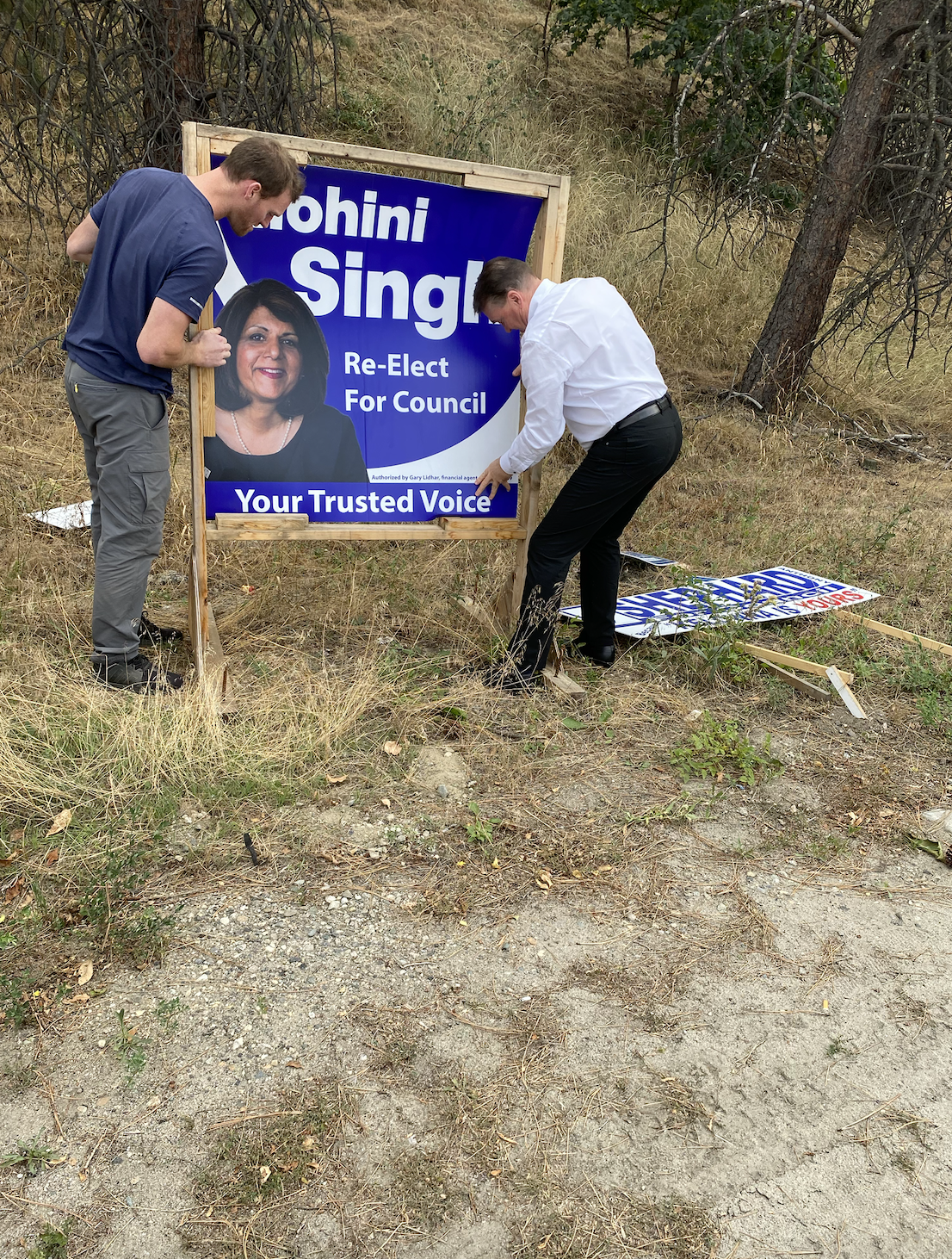 Dyas says he and his campaign team spent hours driving around Kelowna, fixing signs of all candidates that had been damaged. He says he also received a report of a suspicious vehicle seen damaging election signs.