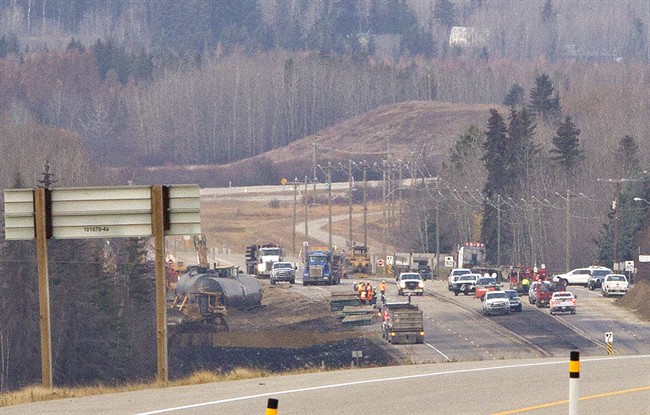 Residents in the hamlet- located about 80 kilometres west of Edmonton- were forced from their homes early Saturday morning after 13 cars on a CN freight train carrying a cargo of oil and liquefied petroleum gas derailed and burst into flames.