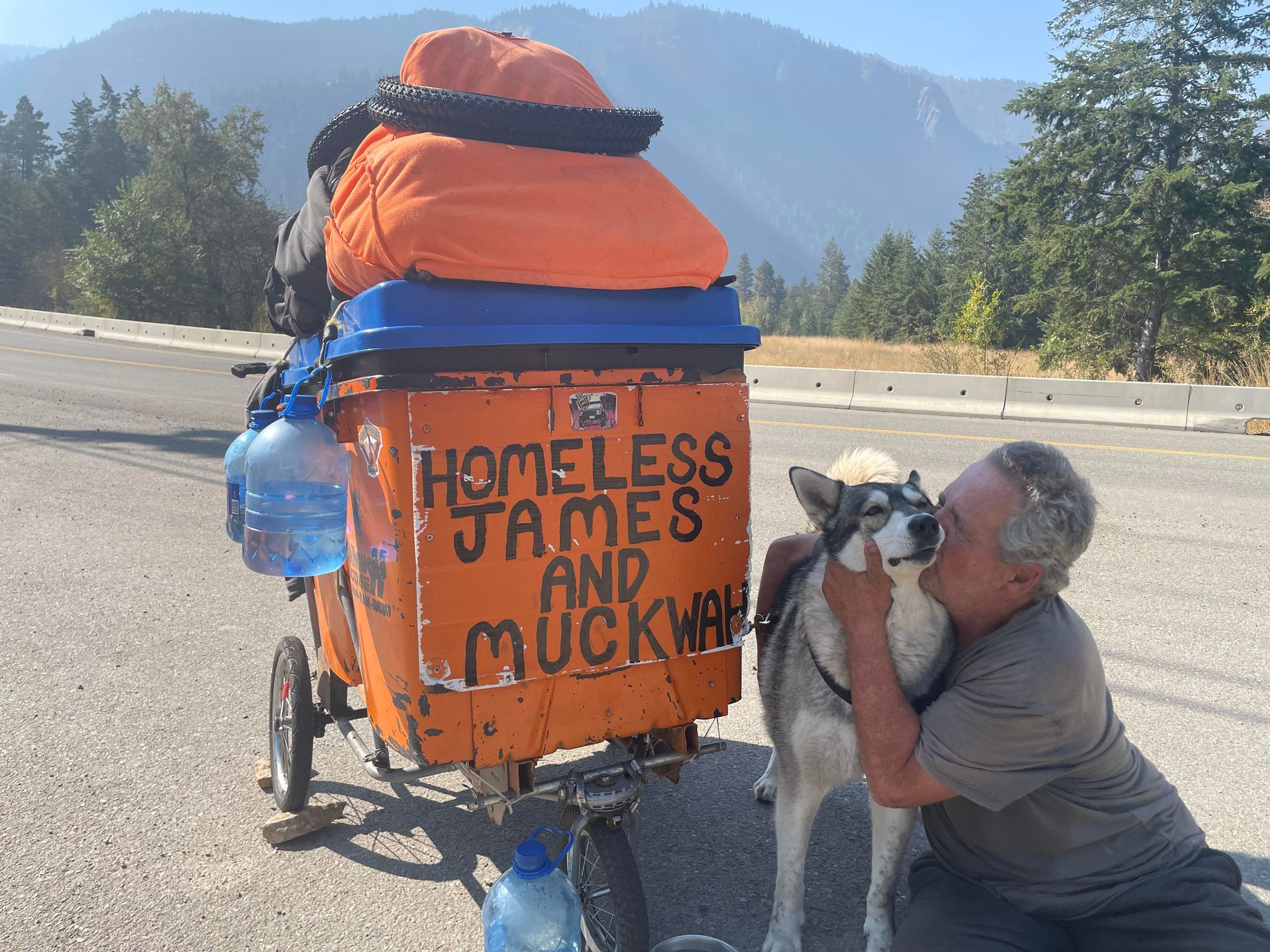 The pair is currently traveling along Highway 3, walking approximately 15 kilometers a day. Caughill pushes his tent and supplies in an orange cart with the sign reading Homeless James and Muckwah.