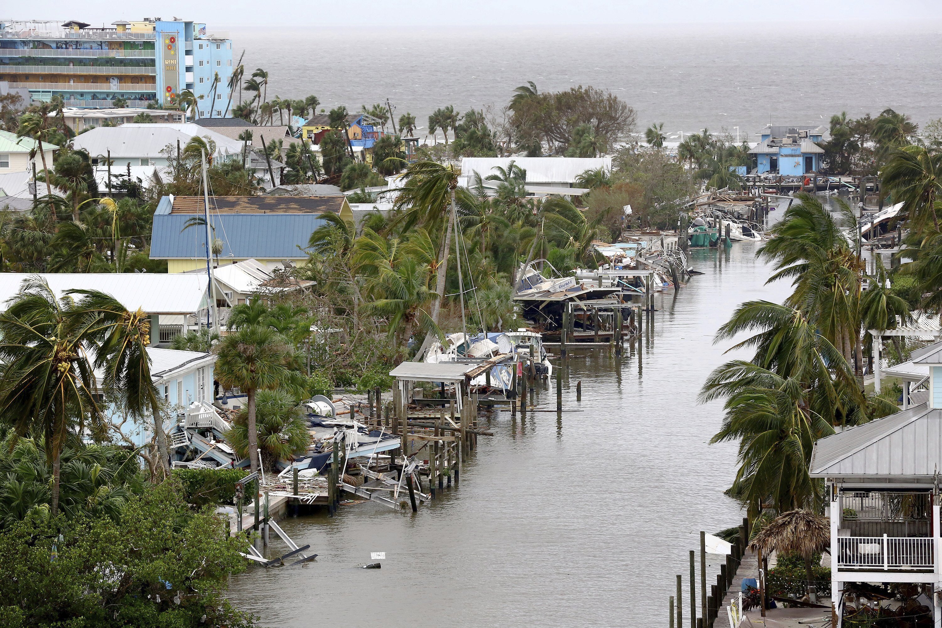 Early video images of the storm’s fury on local TV and social media showed flood waters sweeping away cars, nearly reaching rooftops in some communities and the ruins of homes as palm trees were bent almost in half.