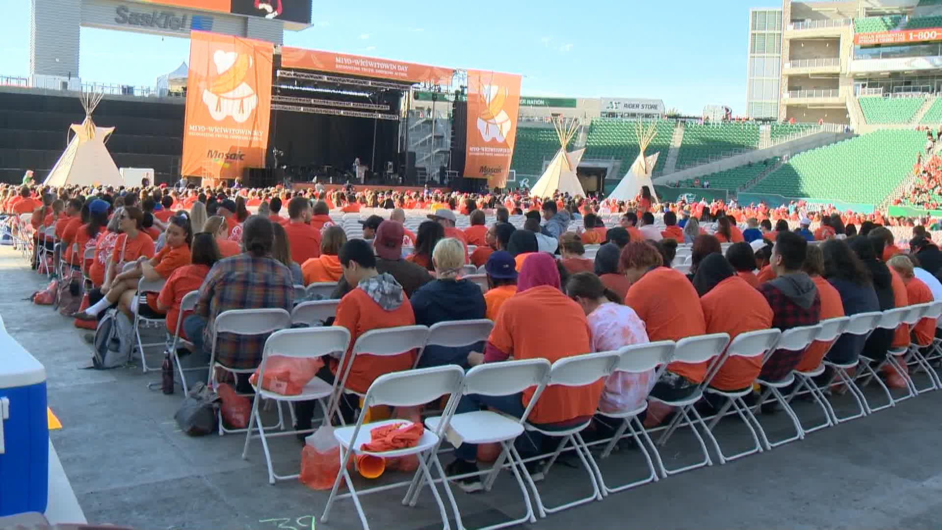 The Miyo-wîcîwitowin Day was held at Mosaic Stadium in Regina on Thursday, bringing thousands of students to the stadium to educate them ahead of the National Day for Truth and Reconciliation on Friday.