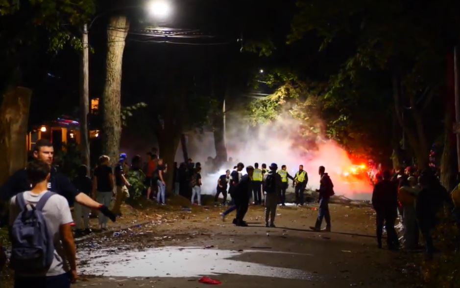 “Participants were climbing poles and trees, fireworks were being set off in the crowd and in some cases directed towards residences. Disturbances and fights were occurring within the large crowd,” the news release said.