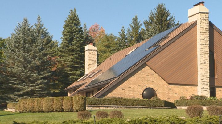 Corley gave Global News a tour of his electrified home, which boasts a wall of solar panels on the roof of his house, a heat pump to regulate temperature and two electric vehicles charged using the power generated from his property.