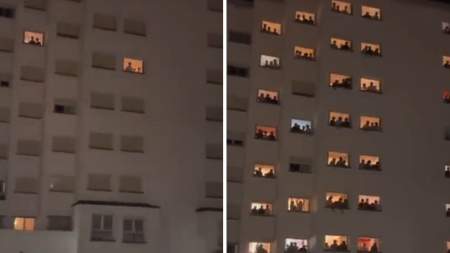 In shocking video shared to social media, dozens of windows open all at once to reveal groups of backlit young men screaming co-ordinated abuse in the direction of an all-female college nearby.