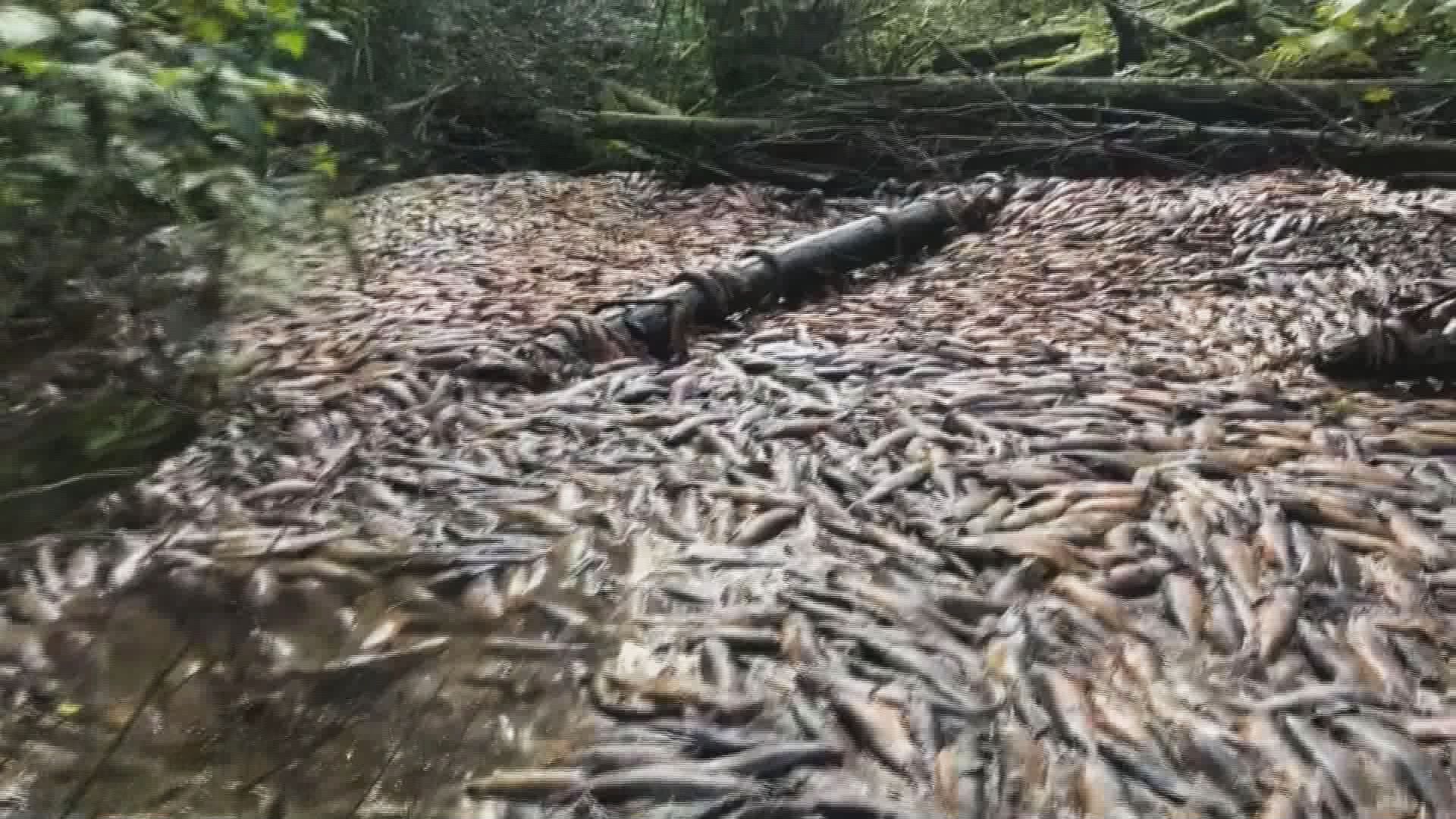 The video shows thousands of salmon dead in the creek bed. The majority of the salmon were pink with about 10 per cent being chum.