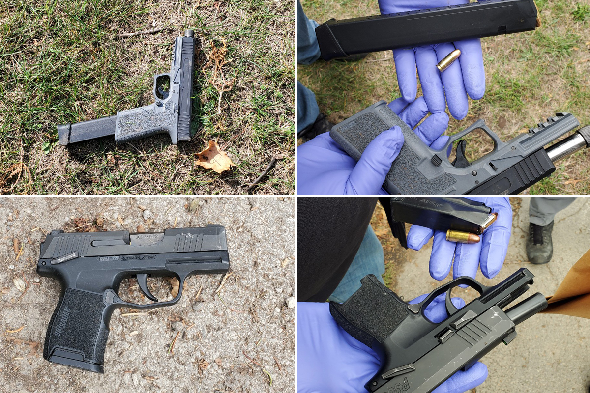Police say officers seized the two guns, one of which had an extended magazine, as well as a large amount of ammunition and a large-capacity drum magazine.