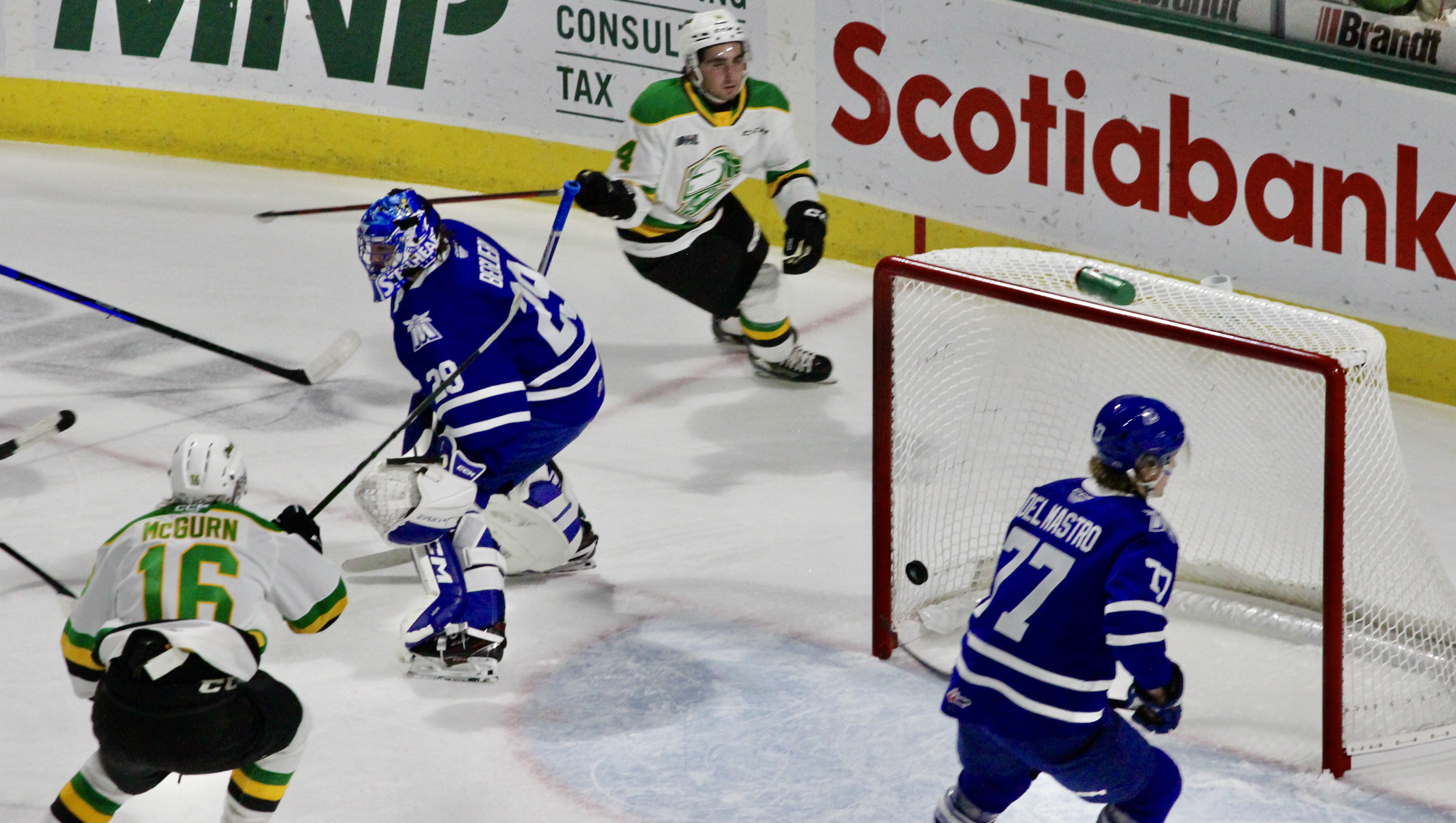 London fell behind early after goals by Charlie Callaghan on a wrap-around and a pick of a top-corner shot by Beck put Mississauga ahead 2-0 only 5:28 into the game.