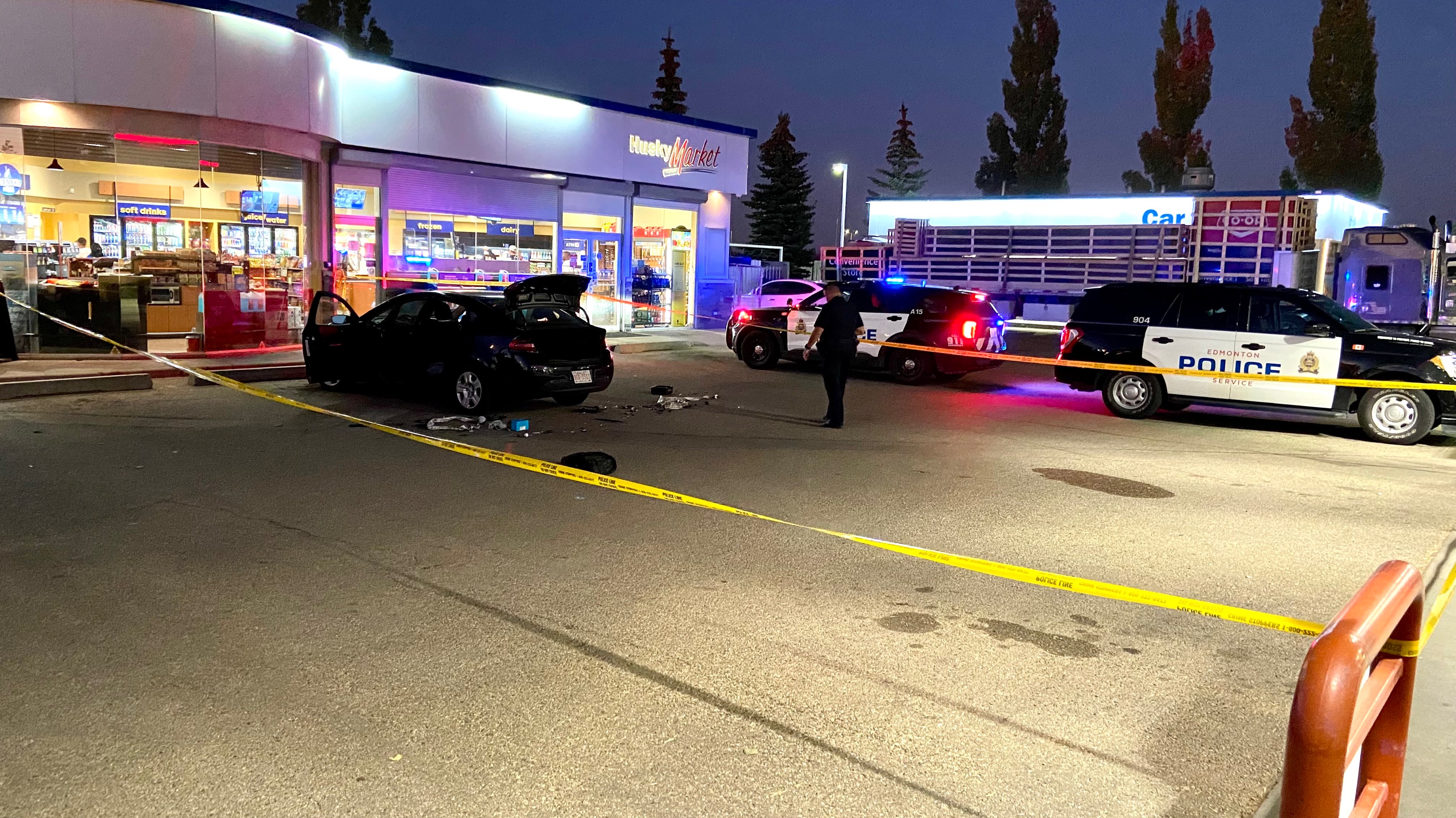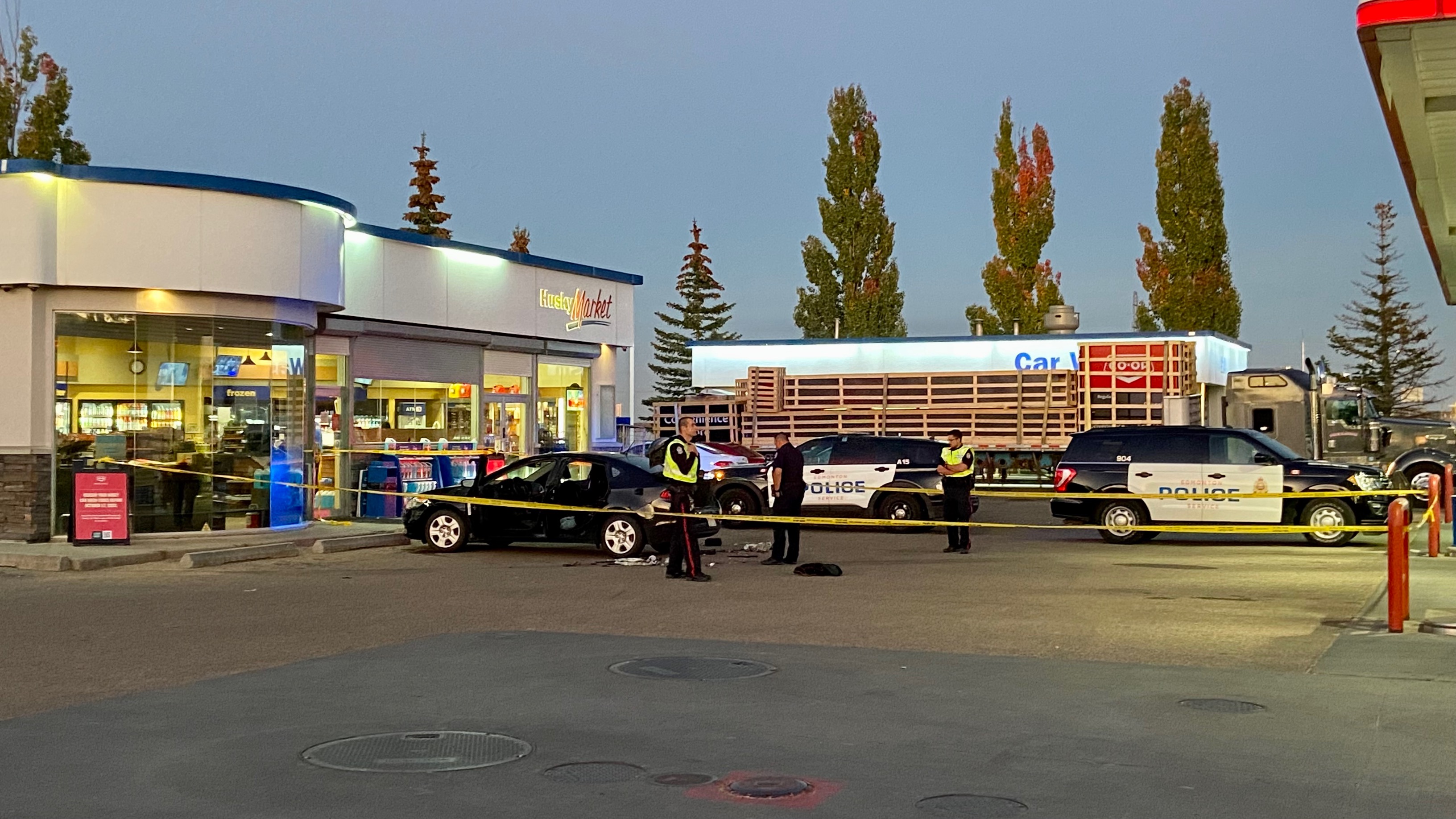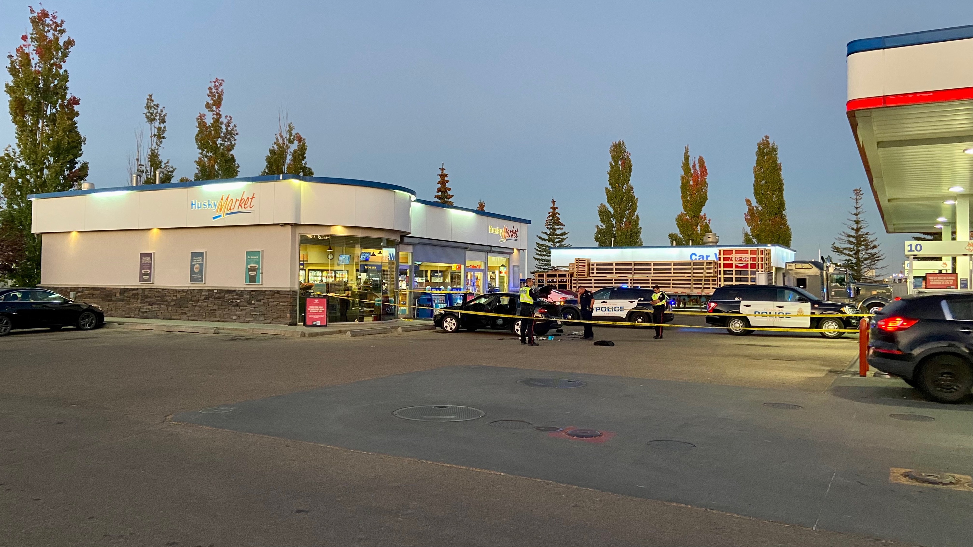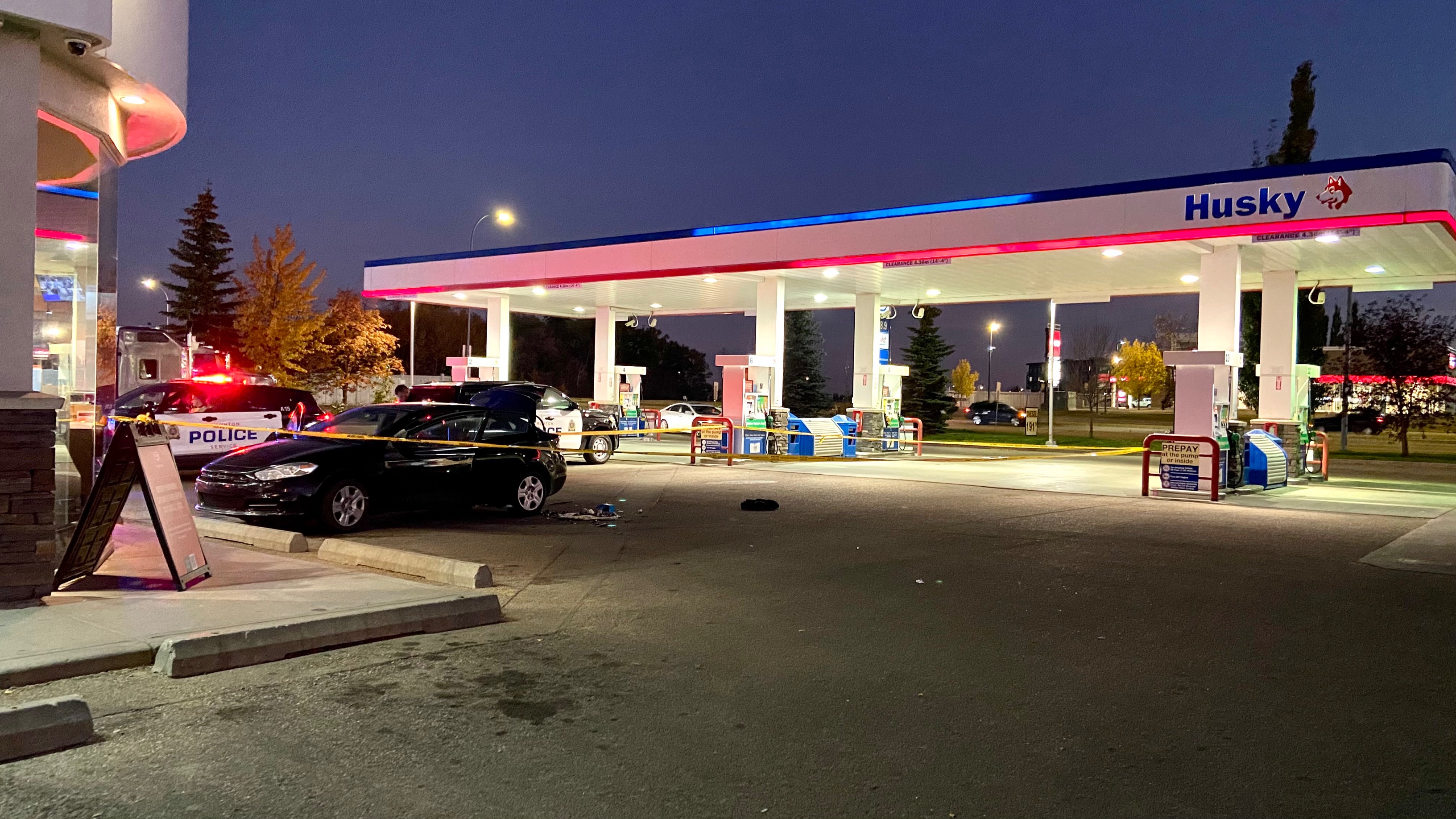 An area surrounding a black car at a Husky gas station in the area was cordoned off by police tape, and several police vehicles and officers could be seen investigating.
