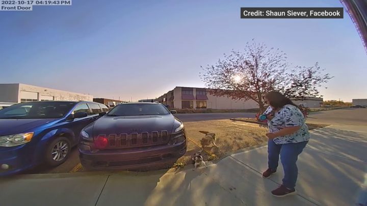 The woman then screams and starts struggling, using the leash to yank the dog out of the coyote’s mouth. Once she has her dog free, she is heard yelling, “Oh my God!” and picks her dog up.
