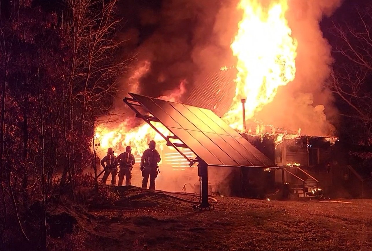 Leeds County OPP tweeted a photo and video of the structure fire on Mountain Road just before 7 a.m., asking residents to steer clear of the area.