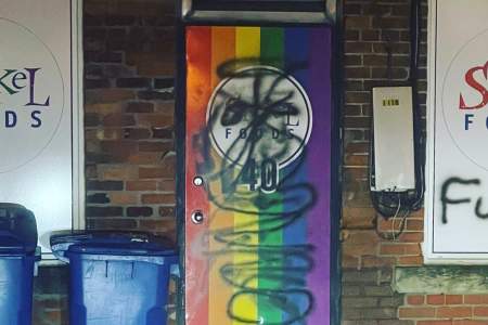 Photos posted online by the owners of Sirkel Foods show black spray paint scrawled on a rainbow-coloured door and dumpster, and a window painted with the words “F— gay.” The downtown business is owned and operated by Kelly Ballantyne and her wife Mel Lang, according to the Stratford Beacon Herald.