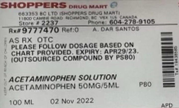 Shoppers Drug Mart has issued an alert about liquid acetaminophen sold at one of its Richmond locations that was improperly labelled.