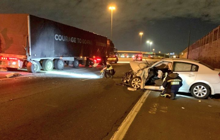 Police said the 62-year-old driver was left with life-threatening injuries after crashing into a stopped transport truck on a bullnose.
