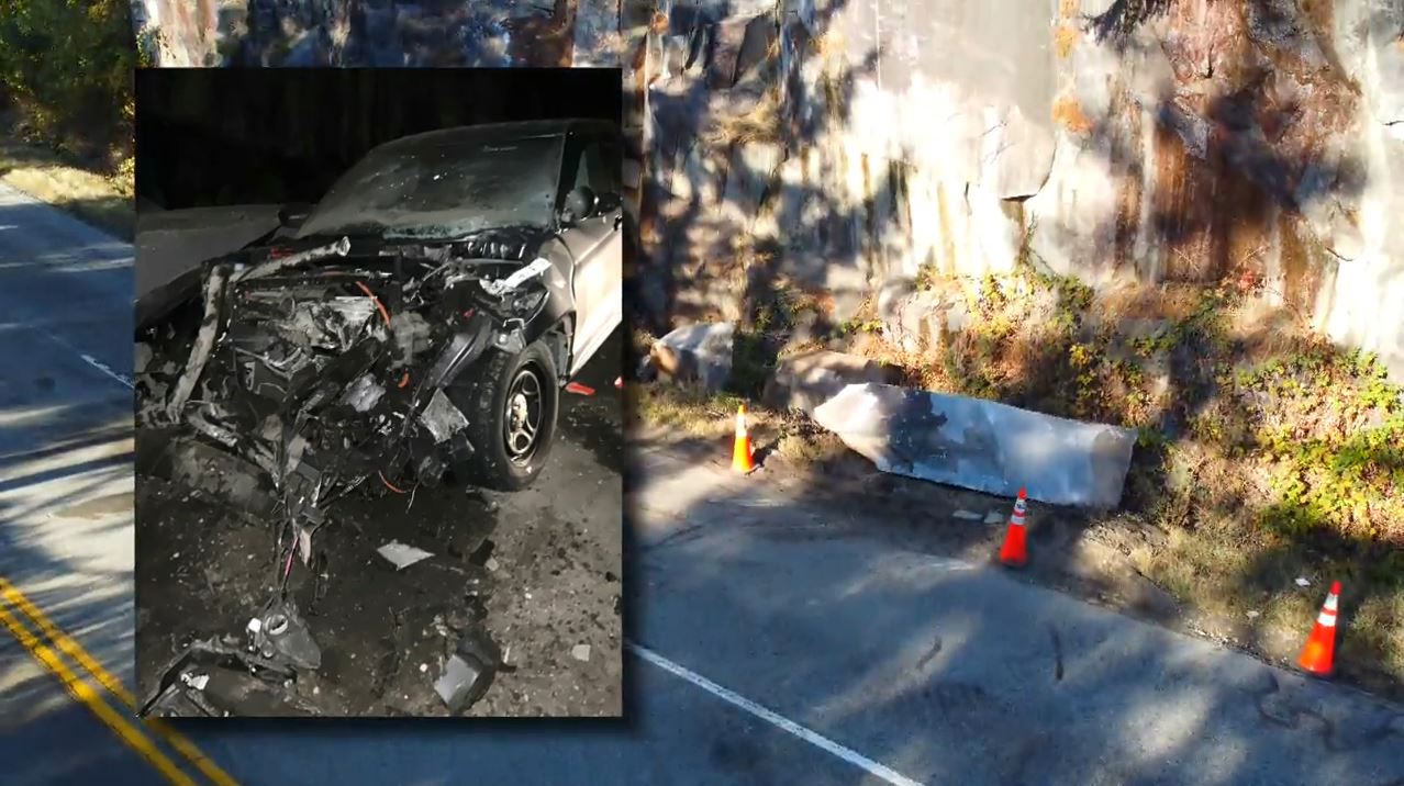 Newly-obtained photos show the crushed front-end of an unmarked police vehicle that was pulverized by boulders Friday night following a rock slide.