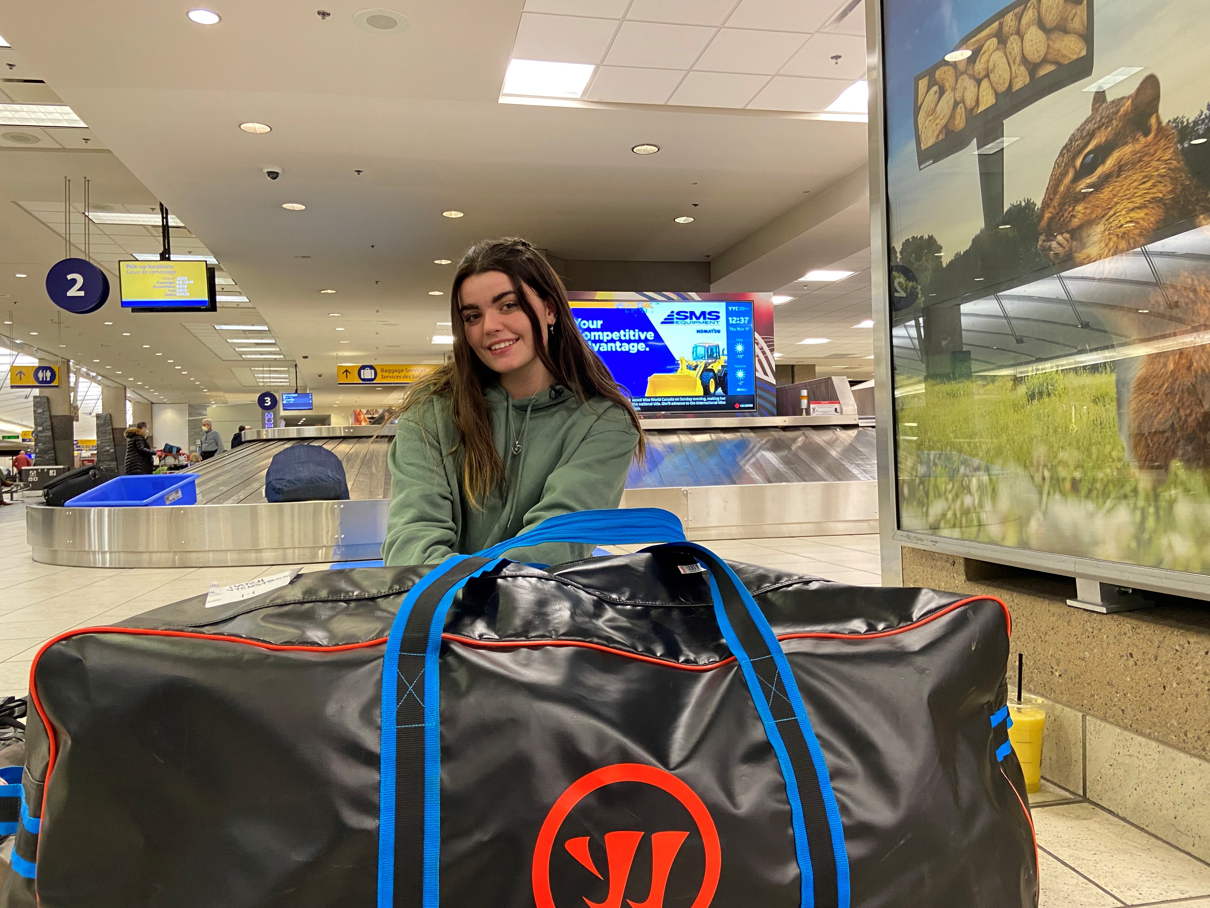 She picked up her goalie bag at the baggage claim desk.