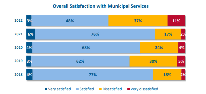 According to the results of the 2022 municipal services survey, just 52 per cent of more than 4,000 respondents said they were satisfied or very satisfied with overall municipal service delivery.