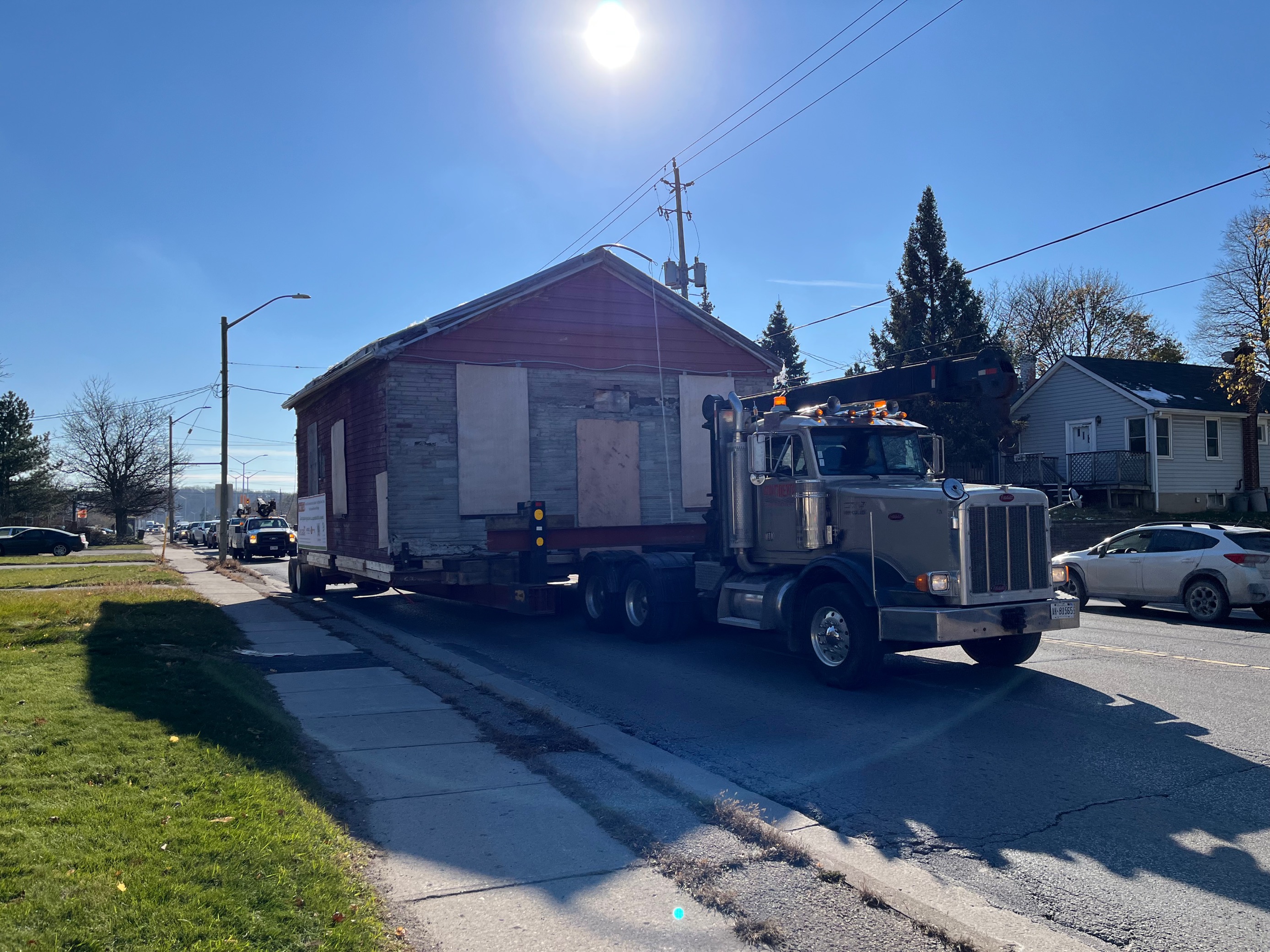 From there, the truck carefully navigated the small, single-storey building through the neighbourhood, under low-hanging power lines, and onto Hamilton Road, where it continued eastward before turning north onto Highbury Avenue around the noon hour.