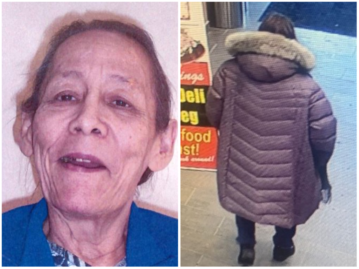 She was last seen wearing a purple, older-looking puffy jacket with purple fur, a purple scarf, purple sweater, and black boots.