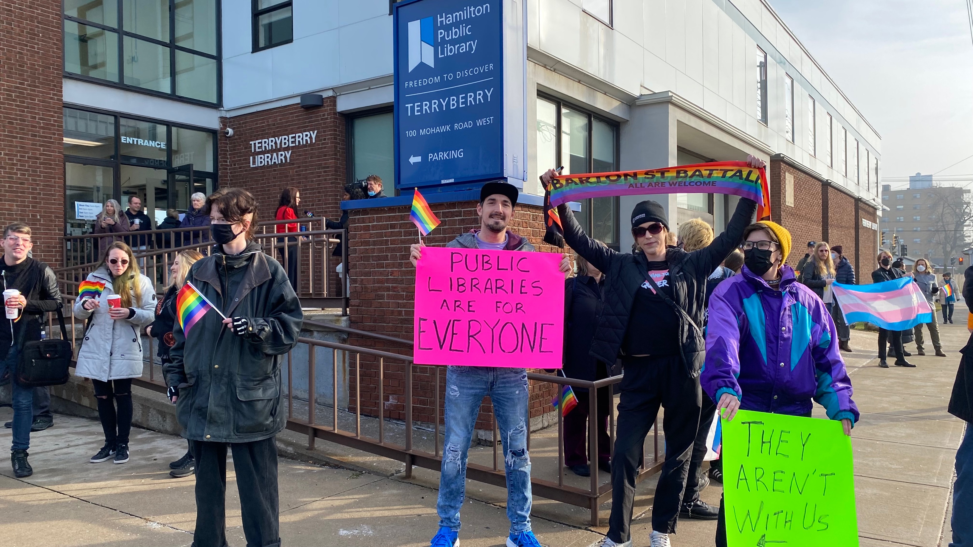 A handful of protesters gathered outside a Hamilton, Ont., public library to oppose a drag queen storytime Thursday morning, but were met with an even bigger group of counter-protesters.