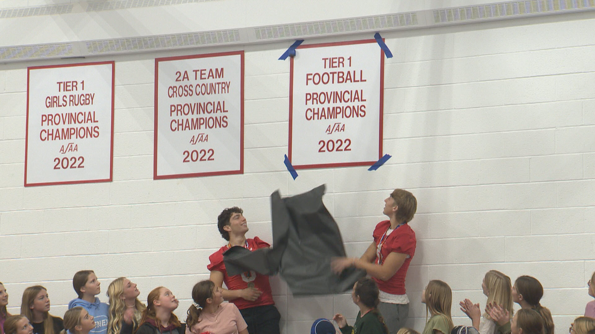 Another banner was added to the Raymond High School gym on Thursday, as the Comets football team celebrated its tier one provincial championship.