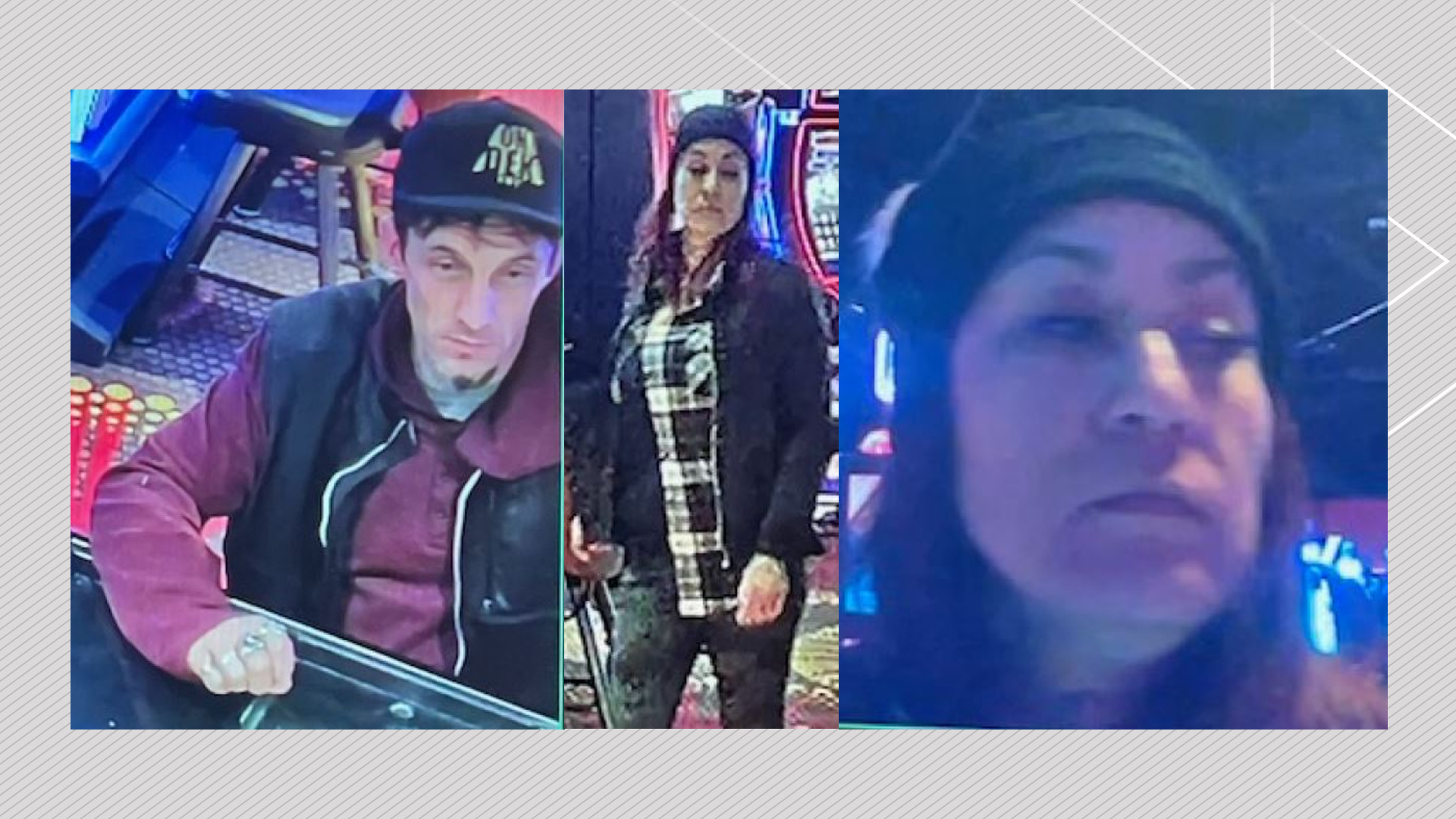 The first suspect is a man, described as having black hair, a skinny build and wearing a burgundy long-sleeve shirt, black vest and black hat with “on dek” written on it.