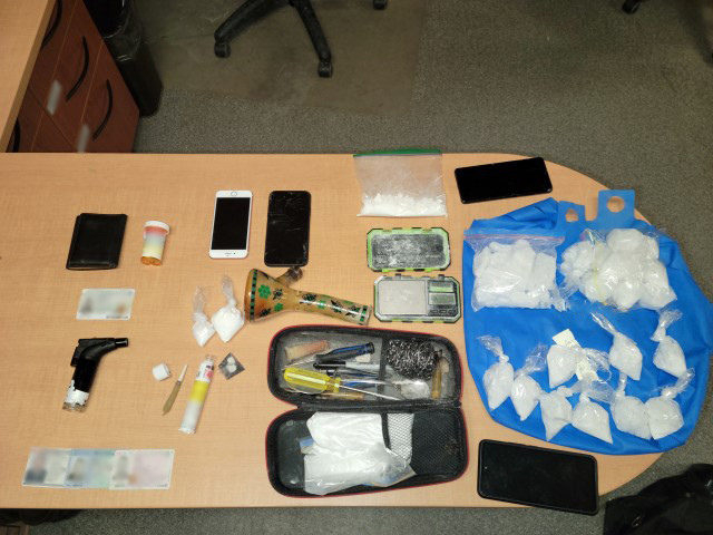 During a search of the vehicle, police say they found about 900 grams of suspected crystal methamphetamine and drug trafficking paraphernalia.