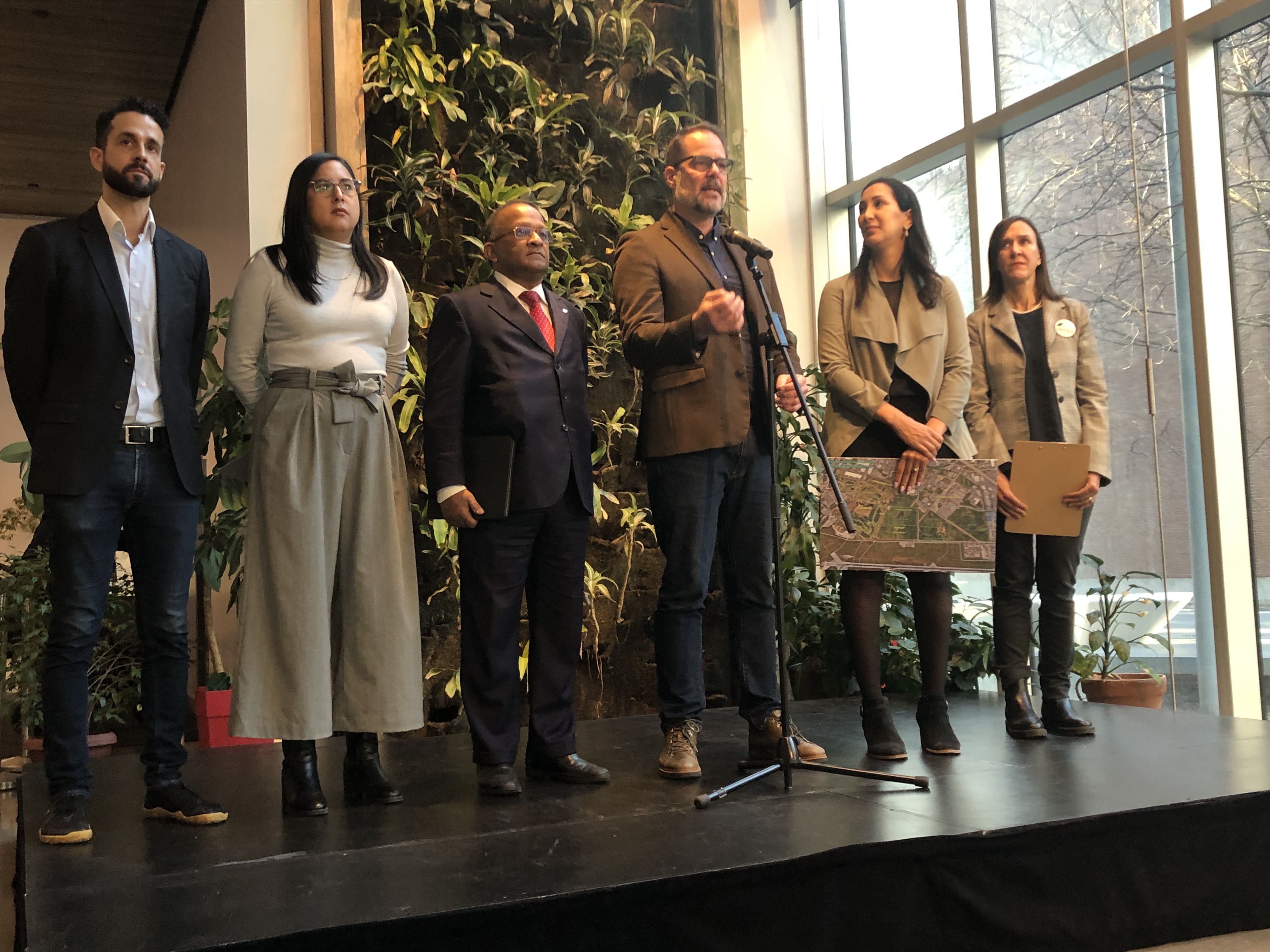 NDP deputy leader Alexandre Boulerice led the green offensive, flanked by members of Quebec’s national assembly and local borough mayors.