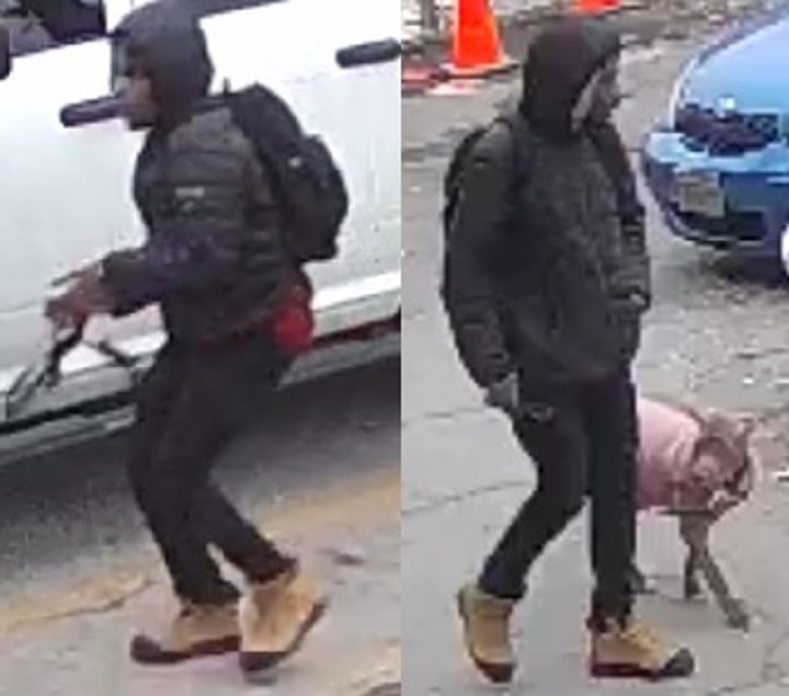 The suspect was last seen wearing a black jacket with a hood, black pants, a black backpack and beige construction boots. He was also walking a dog with a pink jacket.