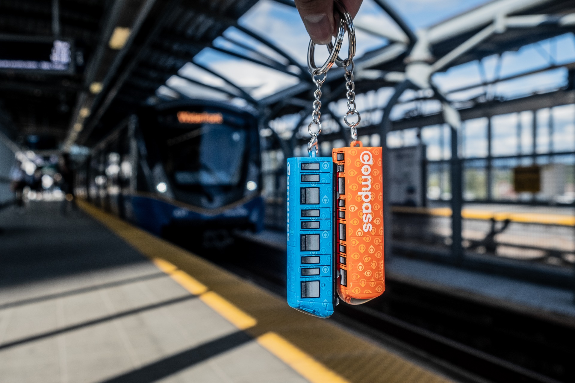 The trains can attach to a normal key ring, and unlike other Compass fare products, they also light up when tapped.