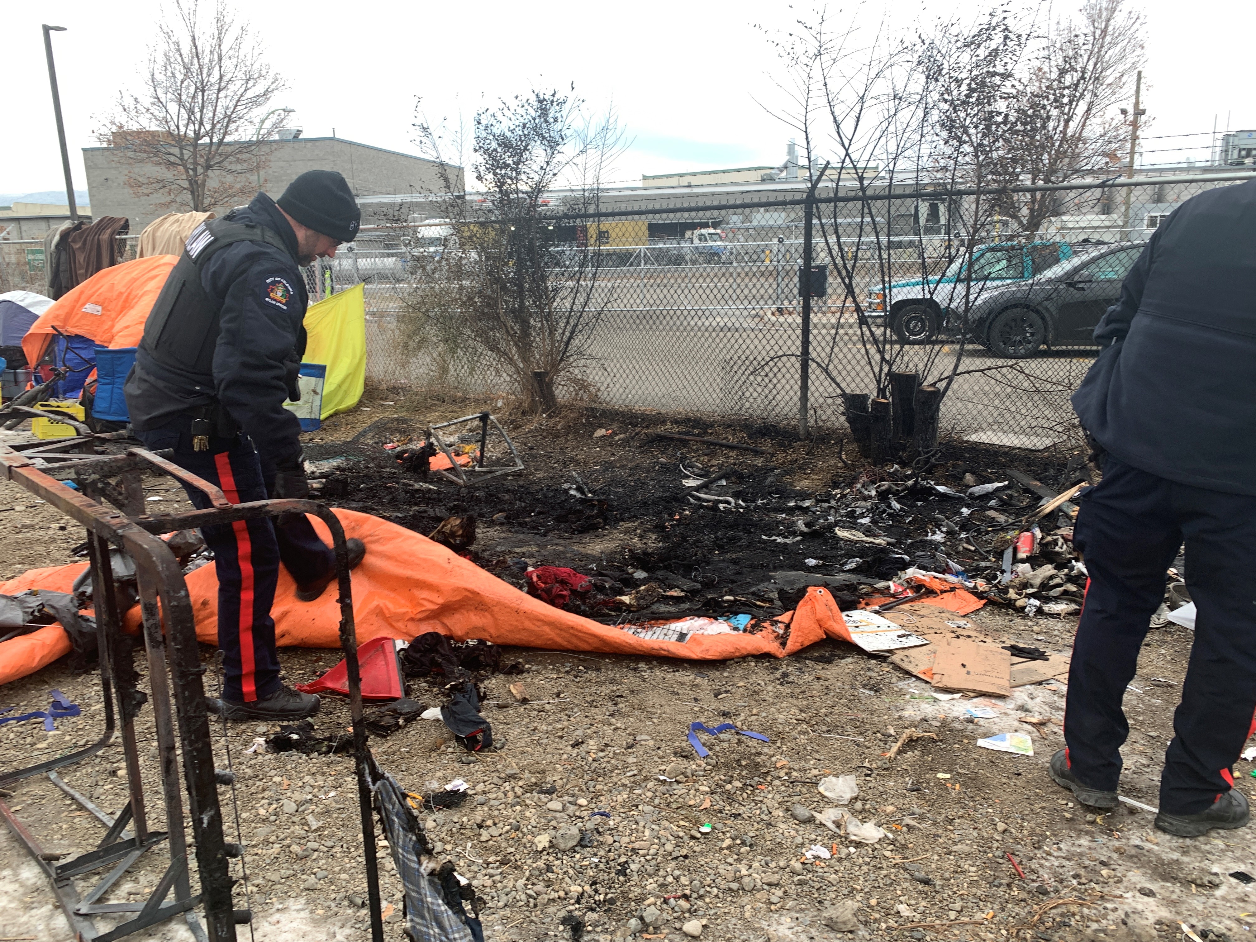 Bylaw officers in Kelowna spent Tuesday morning cleaning up the aftermath of a large tent fire that broke out this week at the city’s homeless encampment near the Okanagan Rail Trail.