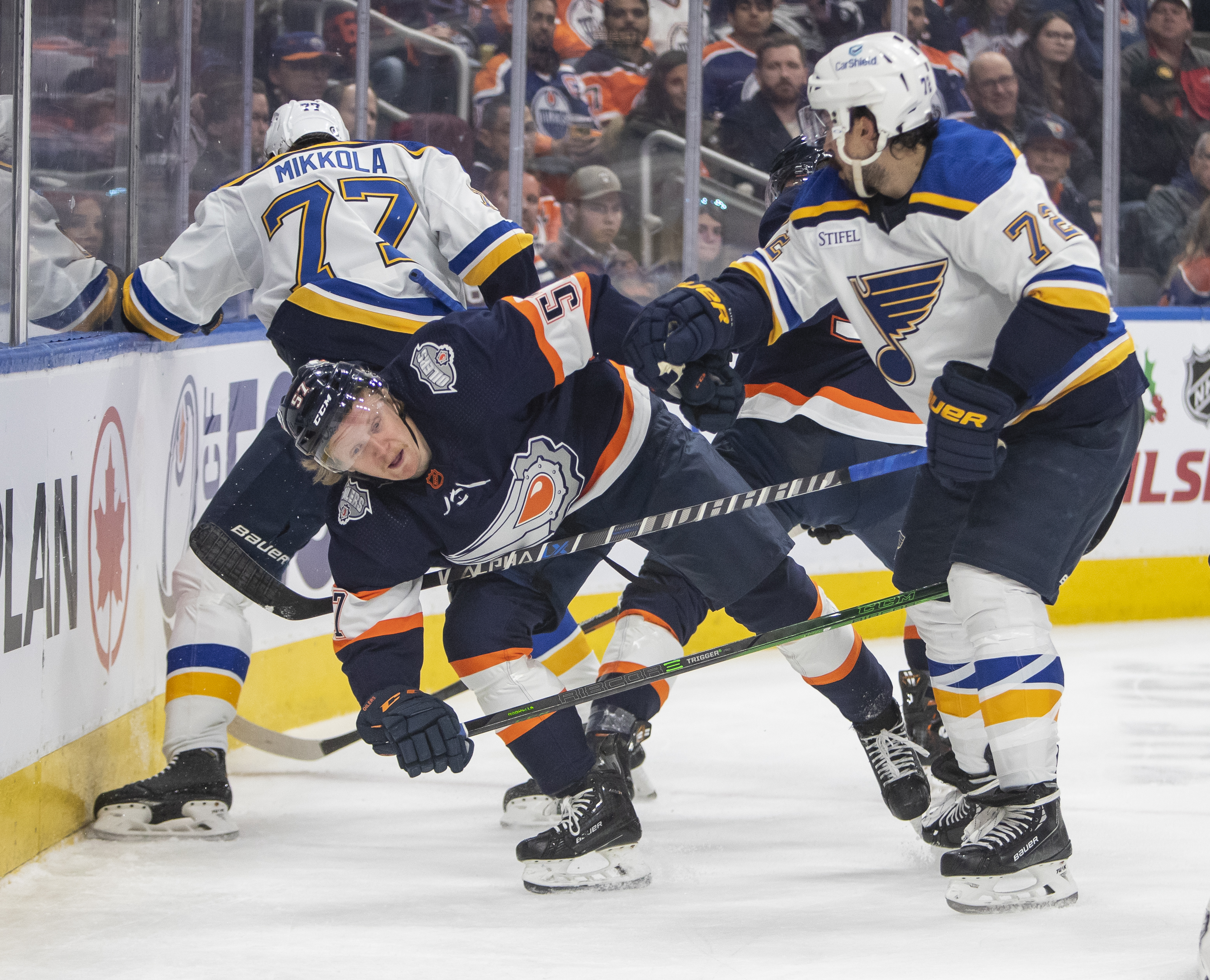 The Blues came back when Darnell Nurse was stripped of the puck behind the Oilers net. St. Louis forward Jordan Kyrou would fire a wrister past Edmonton goaltender Stuart Skinner to make it 1-1.
