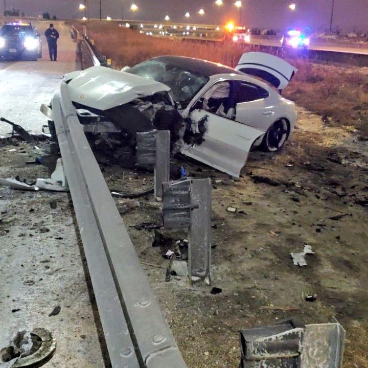 Images posted online by the OPP show a severely damaged white vehicle that had crashed into a guardrail.