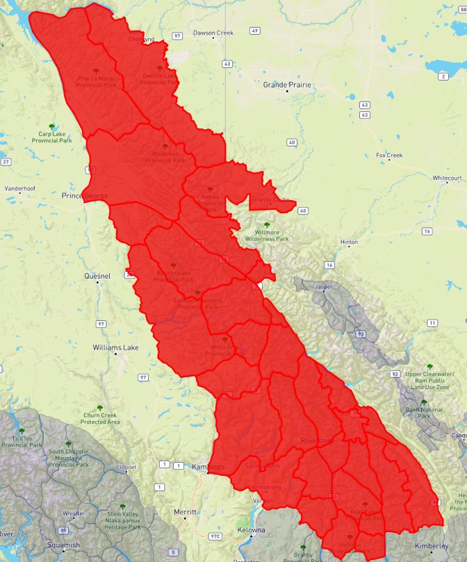 The warning region includes most of B.C.’s Columbia Mountains, Glacier and Mount Revelstoke National Parks, as well as the Northern Rockies. The SPAW extends from the southern boundaries of the Purcell Wilderness Conservancy and Kokanee and Valhalla Provincial Parks to Williston Lake north of Pine Pass and Mackenzie.