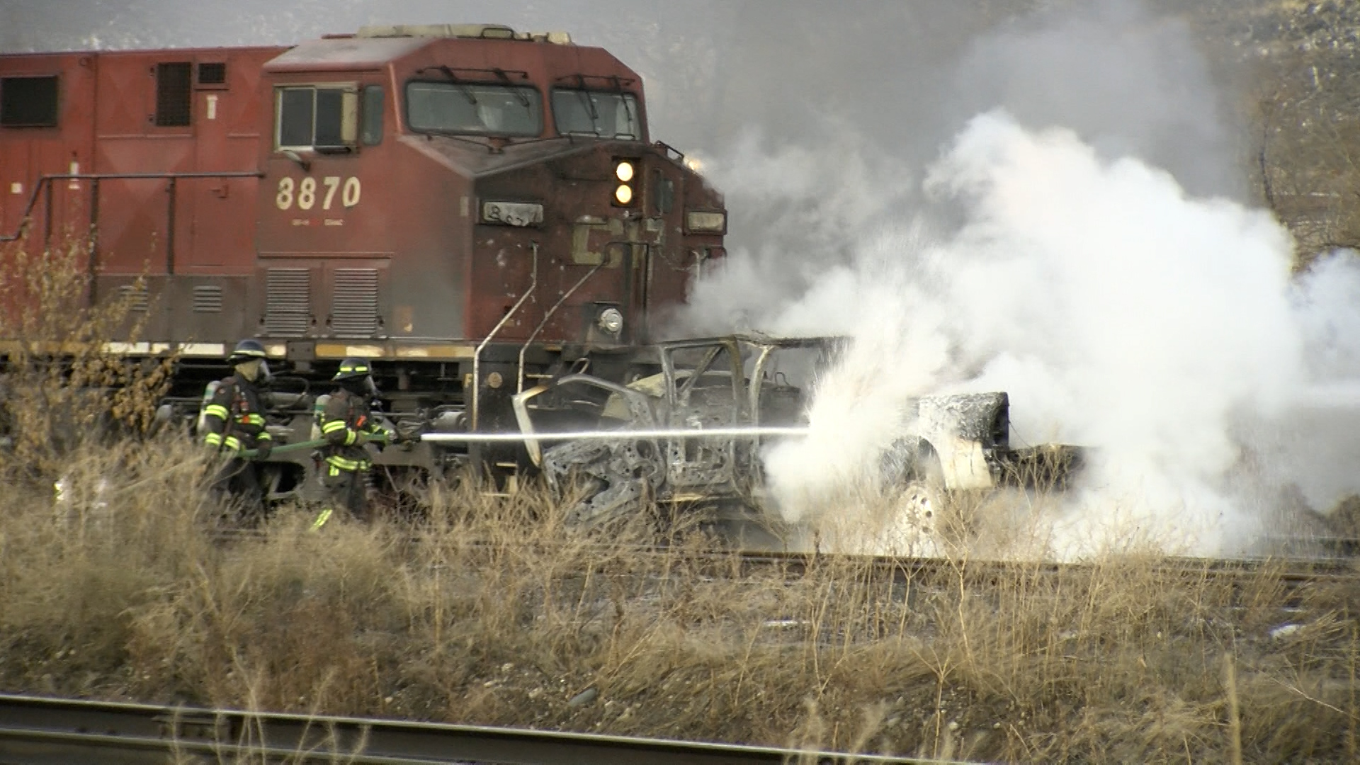 First responders are on scene at train tracks east of Kamloops, where a CP Rail pickup truck was fully engulfed in flames after it seemingly collided with a train.